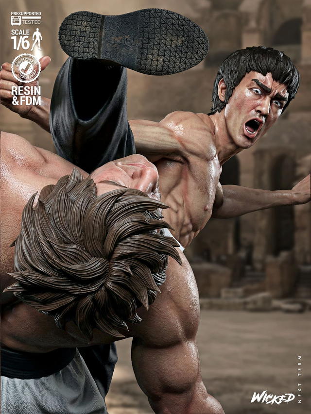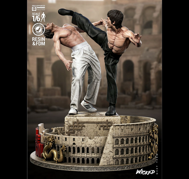 Superbe DIORAMA résine fan art de Bruce Lee et de Chuck Norris, inspirée du film culte La fureur du dragon, sorti en 1972.